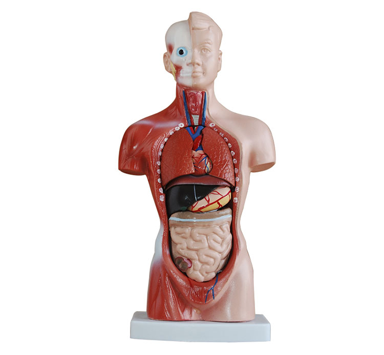 QM/J1203人体半身躯干模型可拆分为15部件,显示无性人体内脏器官的位置及头部解剖的形态和构造,表现呼吸、消化、泌尿、生殖等主要人体解剖系统,头颈半侧显示颅骨、咬肌、颞肌等结构,眼眶内有眼球,胸腔内的两肺额状切面,显示肺内结构,同时显示头颅盖、脑2件、食管气管和主动脉、心、肺4件、胃、横膈膜、肝、胰和脾、肠等。