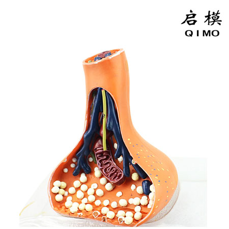 QM/J1644神经末梢突触放大模型为放大的脊髓前角细胞、细胞体发出数目等长短不同的胞突(树突及轴突),主要显示神经元突触、轴突、胞体、胞核、尼氏体、核仁、神经膜雪旺氏细胞核郎、氏结未梢等形态结构。 尺寸:放大120倍,31×28×16cm 材质:PVC材料