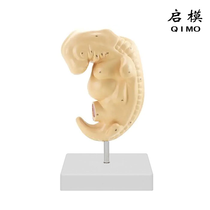 QM/J1812胚胎放大模型为胚胎第4周大小,显示额鼻突、鼻板、视杯、端脑、中脑、菱脑、神经管、心球、心室、肝、上、下肢芽等结构,共有20个部位数字指示标志及对应文字说明。 尺寸:放大约25倍,15×20.5×33cm 材质:PVC材料