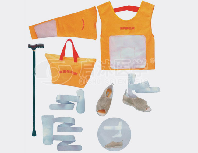 本产品可穿着在学员身上,通过真实的体验,理解偏瘫患者的不便,可与老年人关爱护理模型一并使用,使学员在护理老年人的时候切身体会老人由于身体机能老化或偏瘫而造成的不便,加深护士和健康照顾者对于偏瘫患者的同情和关注。 主要功能: ■ 本模拟装置依据正常成人体型设计。 ■ 能够体验左右偏瘫。 ■ 当限制装置固定后,练习者可体验由于偏瘫而导致的关节僵硬,通过使用粘贴带可调整松紧度以模拟不同程度的关节僵硬。 ■ 配有拐杖,使练习者可体验特定状态下拐杖对于运动的重要性。 ■ 本模型的鞋是为老年人和残疾人设计的,轻便防滑。 ■ 轻巧耐用,材料经济,可广泛使用。