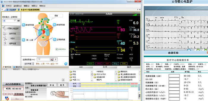 QM/ACLS8000C型高智能数字化综合急救技能训练系统主要功能是提供高级心脏生命支持(ACLS)的多媒体教学课件、操作流程训练和考核。通过虚拟急救案例的模拟及急救技能的培训,帮助医护学员进行标准化的培训。系统由全身男性模拟人、生命体征模拟器、多参数模拟监护仪、计算机为一体的急救教学系统。具有BLS与ACLS急救功能,包括无创血压测量、听诊和识别正常和异常的心音、呼吸音、肠鸣音,脉搏、血压、心电图等生命体征功能。本系统同时适用于面向乡村医师技能培训,并提供心肺复苏、体外除颤等急救技能操作技能,该系统内容有图文、声像、视频相结合,并有操作日志、存贮、考核评估、成绩打印、网络交互等功能。