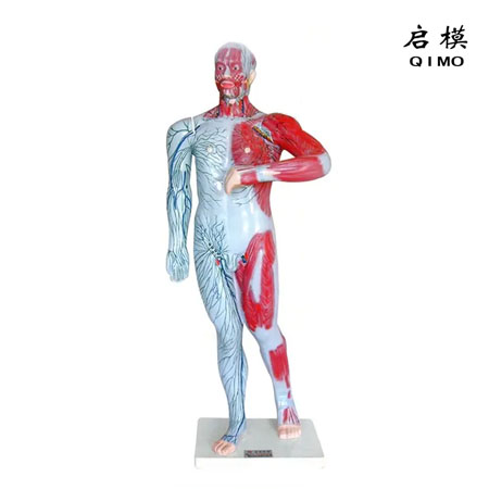 QM/J1110男性全身人体骨骼附主要动脉和神经分布模型显示人体全身主要血管和神经的行程及其分布情况、神经分支、脊椎动脉和腰椎间盘等,由男性全身散骨串制而成一整体骨架,成直立姿势,四肢大的关节部分均可活动,一侧骨骼用红色塑料管显示全身主要的动脉,另一侧骨骼用黄色塑料管显示全身主要的神经分布,头颅含可活动的下巴、可移动的头颅盖、骨缝线和三颗可取下的下牙,其中四肢骨和头颅骨可以灵活拆卸组装,整体固定在支架上,带底座,可灵活移动。