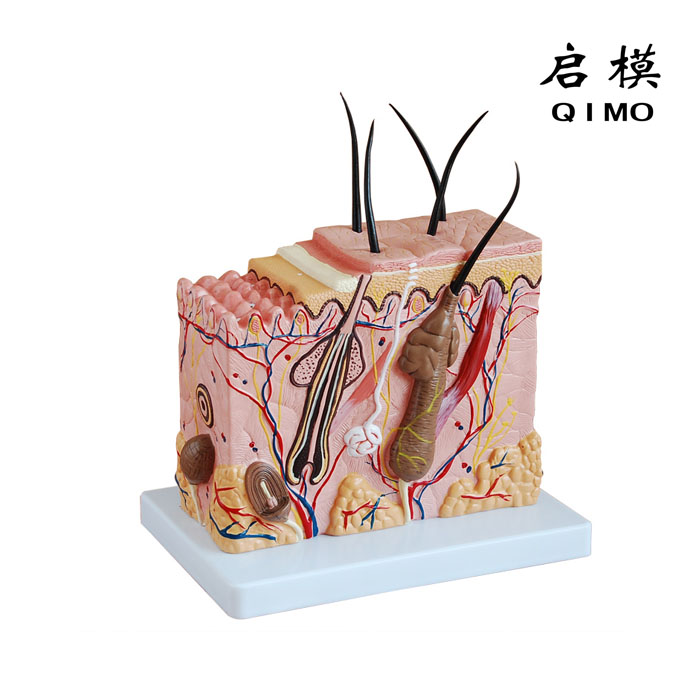 QM/J1820皮肤放大模型放大70倍,显示了不同层面的人类皮肤层次及毛发结构,展示了毛发、毛囊、脂腺、汗腺、皮肤感受器、神经和血管,置于基板上,共有17个部位数字指示标志及对应文字说明。 尺寸:放大约70倍,23×22×11cm 材质:PVC材料