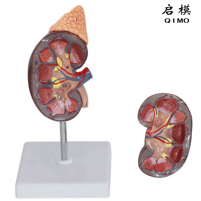 QM/J1705A肾解剖附肾上腺模型可拆分为2部件,显示肾的上、下两端、内外两缘及前后两面的外形特征,在肾的剖面上显示肾的皮质和髓质、肾锥体、肾乳头、肾柱、肾小盏、肾大盏、肾盂、肾上腺及部分肾动静脉分支、属支的断段,还显示输尿管的起始部,共有10个部位数字指示标志及对应文字说明。 尺寸:自然大,11×11×19cm 材质:PVC材料