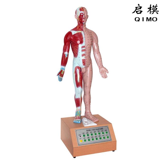 QM/85B电动语言十四电动针灸模型一侧示肌肉、皮神经,一侧示十四经脉、穴位及经外穴,共展示360个穴位点及十四经脉起止经过(含经外穴),控制面板上有各条经脉对应的按钮,按动按钮,有灯光显示及语音播报经脉线名称及其经脉上对应的穴位名称。 尺寸:高85cm 材质:玻璃钢