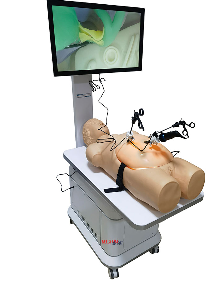 功能特点: ■ QM/FQJ600腹腔镜手术技能训练人体模型可用于外科及妇产科在手术台上用腹腔镜手术器械、高清摄像机及监视器对常见腹腔疾病腹腔镜手术的模拟训练,可进行腹腔镜手术的切开、剥离、止血、结扎、缝合等基本手术操作。 ■ 模拟腹腔镜30度镜可达到多方位观察的目的,光源LED、摄像机,镶嵌在镜头中,人体模型腹腔内的视野图像输出到22寸彩色屏幕上,操作者通过观察屏幕上的图像进行操作。 ■ 模拟腹腔镜可通过拉伸调节镜头与目标的距离调节焦距改变图像的清晰度,镜头靠近腹内模型时获得局部放大图像,后退至套管口时获得腹腔内较广泛的视野,可根据操作精细度和观察需要及时调节,镜头中心视野应对准术者的器械随之移动,根据需要调整近距或远景视野。 ■ 模拟腹腔内可放置各种训练模型,包括彩豆模型、套圈模型、缝合板模型、多形状缝合模块、囊状器官模型、盲肠阑尾模型、肝胆模型、子宫附件、穿线模型、横结肠、肾及输尿管、胰腺和脾、血管模型、肠模型、器官粘连模型,可将各种训练模型根据教学需要选取一种,置入腹腔中。 · 套圈模型:在圆柱型的胶块上设有6个倒L型钢钩,受训者用抓钳抓取小圈套在其上,套满为止,反复训练,可逐渐提高速度。 · 彩豆模型:将容器内的各种颜色彩豆,抓取指定的颜色,分别抓到各自的容器中。 · 穿线模型:10余个锥形胶块的顶部,设有直径有2-3mm小的钢圈,用持针器夹持缝合线,逐个穿过钢圈,直至穿完。 · 囊状器官模型:细的部分可进行切开吻合,膨大部分可进行切开缝合或切除部分后吻合。 · 血管模型:可进行小血管结扎的训练。 · 各部内腔器官模型:使用时粘贴在背板上,防止操作时移动,对各种器官可进行切开、止血、剥离、缝合、打结练习。 · 肝胆囊模型:可进行胆囊摘除术训练,肾及输尿管模型,可进行输尿管吻合,结石取出术。 · 肠模型:可进行肠(切开)吻合术。 · 盲肠阑尾模型:可进行阑尾切除术训练,其他器官可练习剥离切除缝合等练习,模拟阑尾动脉、胆囊动脉可更换。