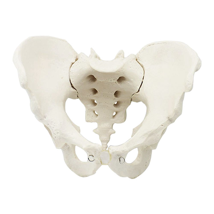 QM/J1130男性骨盆模型由左右髋骨和骶骨尾骨及耻骨联合组成,显示正常人体男性骨盆的组成、形态和结构特征。 骨盆全形:高而狭窄 骨盆腔形状:形似漏斗 骨盆上口:近似心脏形 骶骨:较狭窄且长,弯曲度较大 耻骨弓的角度:70-75度 耻骨联合:狭而长 尺寸:自然大,24×14×18cm 材质:PVC材料