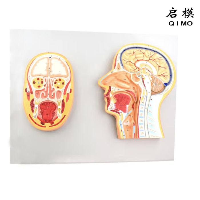 QM/J1628头中部和前部断层面模型由2部件组成,置于基板上,头部作正中矢状切、额状切,显示头中部和前部断层面的结构,共有51个部位指示数字标识标志及对应文字说明。 尺寸:自然大,53×38×6.5cm 材质:PVC材料