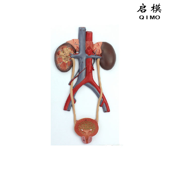 QM/J1701B泌尿系统模型由泌尿系统各器官的肾、输尿管、膀胱剖面等组成,显示泌尿系统各器官、肾剖面的肾皮质、肾髓质以及膀胱和前列腺剖面等结构,共有19个部位指示数字标识标志及对应文字说明。 尺寸:自然大,40×26×4cm 材质:PVC材料